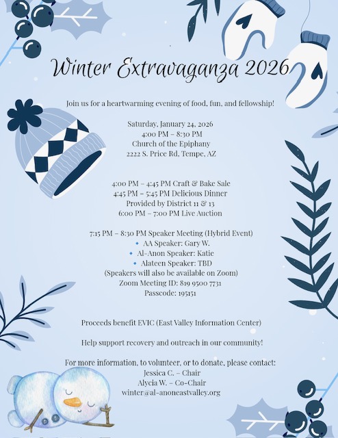 2026 Winter ExtravaganzaBy HOPE / January 24, 2026 When January 24, 2026 4:00 pm - 7:00 pm Add To Calendar Download ICS Google Calendar iCalendar Office 365 Outlook Live Where Church of the Epiphany 2222 South Price Road, Tempe, Arizona Event Type Winter Extravaganza Loading Map.... Church of the Epiphany2222 South Price Road - TempeEvents 33.403368 -111.893103 Family Recovery Night Flyer PDF FRN Zoom Link